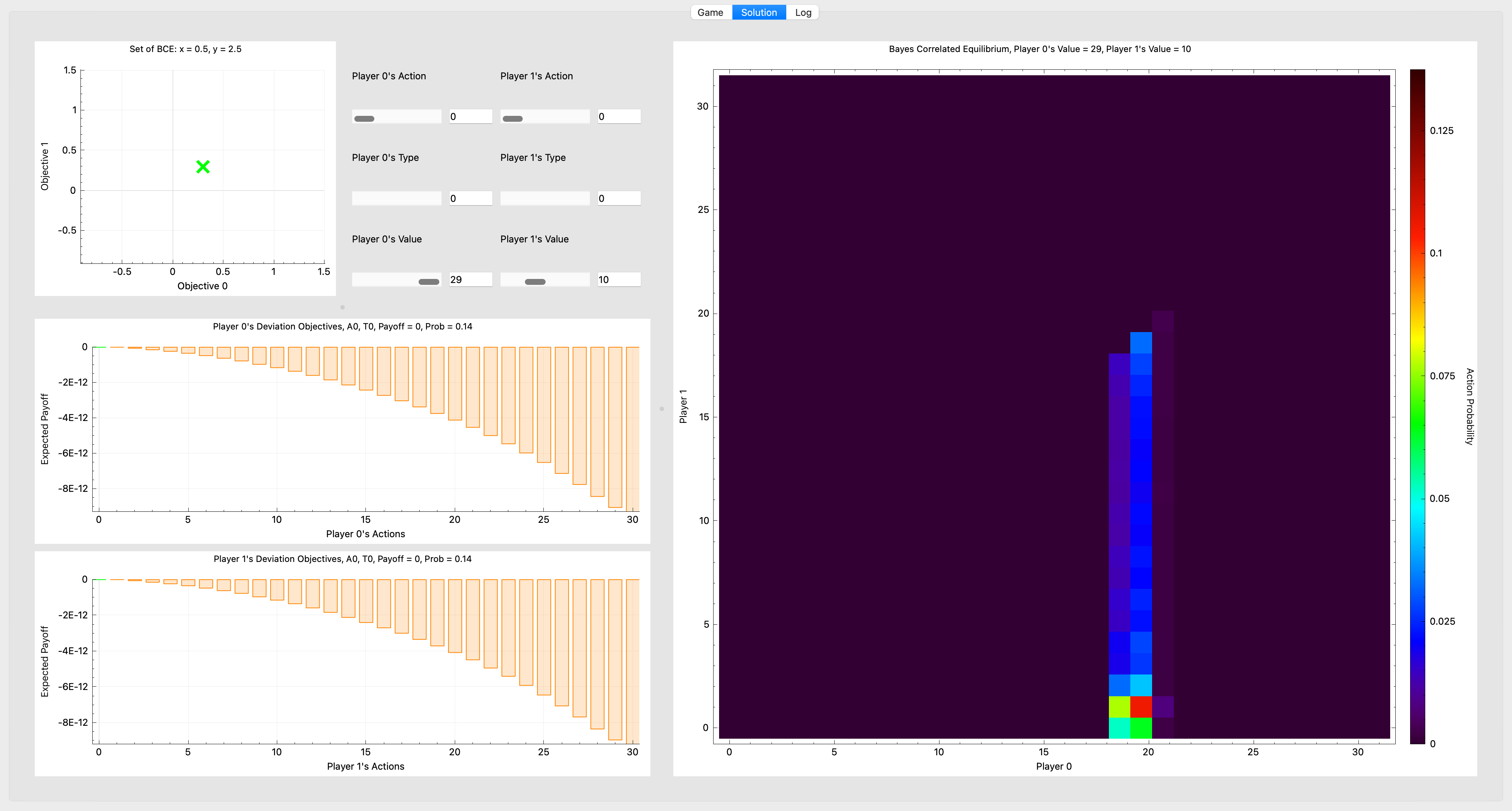 This package consists of tools for finding the set of Bayes correlated equilibria (BCE) for a given game of incomplete information. There is an abstract class for games, from which the user can derive classes for their own game of interest. We include examples for auctions and Bertrand competition. In addition, there are classes for using Gurobi to solve for the set of BCE, and a serialization class that uses Boost to save games for further analysis. A Qt-based graphical interface is also provided for visualizing BCE. There is also an interface called bcemex and a graphical interface called bcegui for studying the solution information in MATLAB. Here is a picture of the graphical interface in action.